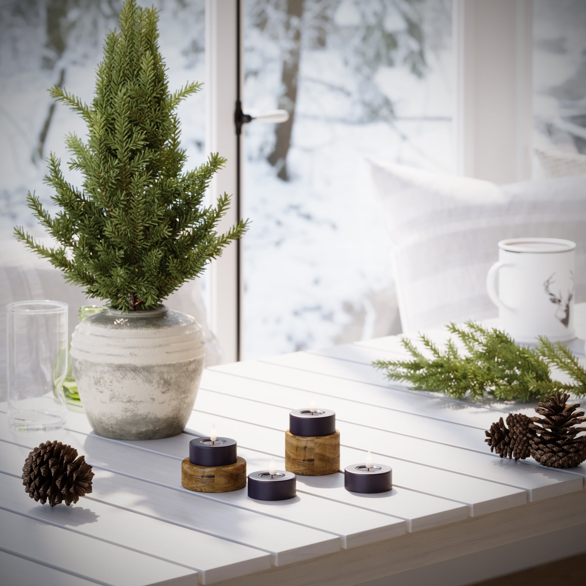 For et roligt helhedsindtryk kan du samle lysene på et fad og variere højderne, mens farverne holdes i samme palette.