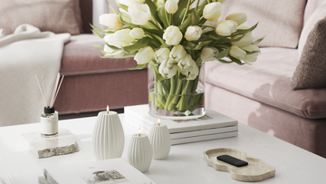 Vela canelada combina bem com luzes suaves. Use-os na mesma escala de cores para uma expressão harmoniosa.